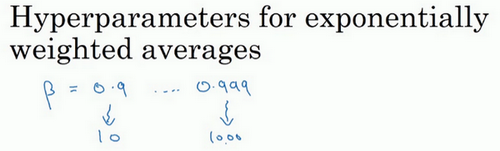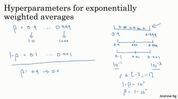 最后,另一个棘手的例子是给 取值,用于计算指数的加权平均值。假设你认为是0.9到0.999之间的某个值,也许这就是你想搜索的范围。记住这一点,当计算指数的加权平均值时,取0.9就像在10个值中计算平均值,有点类似于计算10天的温度平均值,而取0.999就是在1000个值中取平均。