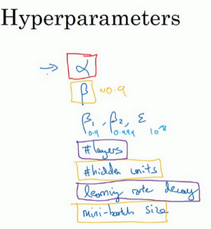 除了,还有一些参数需要调试,例如Momentum参数,0.9就是个很好的默认值。我还会调试mini-batch的大小,以确保最优算法运行有效。我还会经常调试隐藏单元,我用橙色圈住的这些,这三个是我觉得其次比较重要的,相对于而言。重要性排第三位的是其他因素,层数有时会产生很大的影响,学习率衰减也是如此。当应用Adam算法时,事实上,我从不调试,和,我总是选定其分别为0.9,0.999和,如果你想的话也可以调试它们。