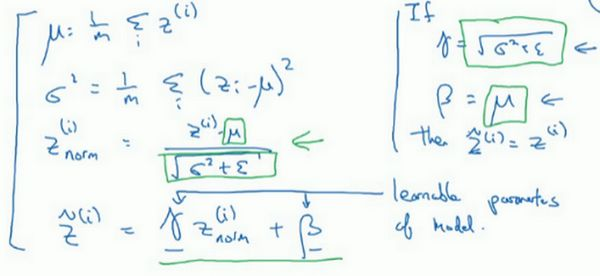 通过对和合理设定,规范化过程,即这四个等式,从根本来说,只是计算恒等函数,通过赋予和其它值,可以使你构造含其它平均值和方差的隐藏单元值。