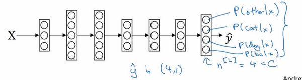 在这个例子中,我们将建立一个神经网络,其输出层有4个,或者说个输出单元,因此,即输出层也就是层的单元数量,等于4,或者一般而言等于。我们想要输出层单元的数字告诉我们这4种类型中每个的概率有多大,所以这里的第一个节点(最后输出的第1个方格+圆圈)输出的应该是或者说我们希望它输出“其它”类的概率。在输入的情况下,这个(最后输出的第2个方格+圆圈)会输出猫的概率。在输入的情况下,这个会输出狗的概率(最后输出的第3个方格+圆圈)。在输入的情况下,输出小鸡的概率(最后输出的第4个方格+圆圈),我把小鸡缩写为bc(baby chick)。因此这里的将是一个维向量,因为它必须输出四个数字,给你这四种概率,因为它们加起来应该等于1,输出中的四个数字加起来应该等于1。