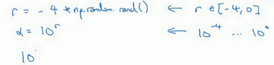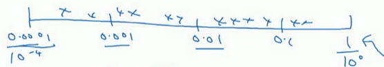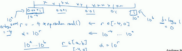 更常见的情况是,如果你在和之间取值,在此例中,这是(0.0001),你可以通过算出的值,即-4,在右边的值是,你可以算出的值,即0。你要做的就是在区间随机均匀地给取值,这个例子中,然后你可以设置的值,基于随机取样的超参数。