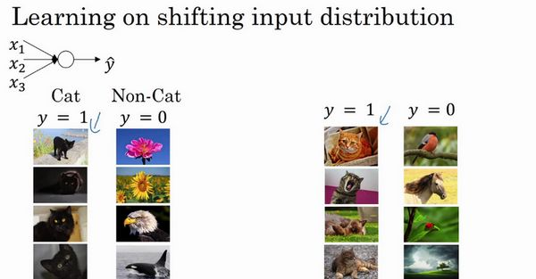 所以使你数据改变分布的这个想法,有个有点怪的名字“Covariate shift”,想法是这样的,如果你已经学习了到 的映射,如果 的分布改变了,那么你可能需要重新训练你的学习算法。这种做法同样适用于,如果真实函数由 到 映射保持不变,正如此例中,因为真实函数是此图片是否是一只猫,训练你的函数的需要变得更加迫切,如果真实函数也改变,情况就更糟了。