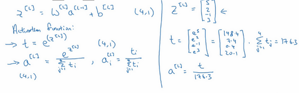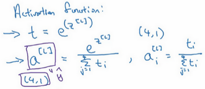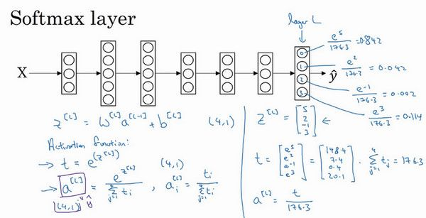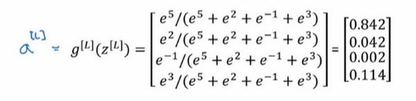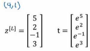 在神经网络的最后一层,你将会像往常一样计算各层的线性部分,这是最后一层的变量,记住这是大写层,和往常一样,计算方法是,算出了之后,你需要应用Softmax激活函数,这个激活函数对于Softmax层而言有些不同,它的作用是这样的。首先,我们要计算一个临时变量,我们把它叫做t,它等于,这适用于每个元素,而这里的,在我们的例子中,是4×1的,四维向量,这是对所有元素求幂,也是一个4×1维向量,然后输出的,基本上就是向量,但是会归一化,使和为1。因此,换句话说,也是一个4×1维向量,而这个四维向量的第个元素,我把它写下来,,以防这里的计算不够清晰易懂,我们马上会举个例子来详细解释。