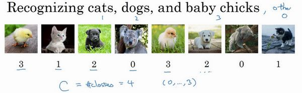 假设你不单需要识别猫,而是想识别猫,狗和小鸡,我把猫加做类1,狗为类2,小鸡是类3,如果不属于以上任何一类,就分到“其它”或者说“以上均不符合”这一类,我把它叫做类0。这里显示的图片及其对应的分类就是一个例子,这幅图片上是一只小鸡,所以是类3,猫是类1,狗是类2,我猜这是一只考拉,所以以上均不符合,那就是类0,下一个类3,以此类推。我们将会用符号表示,我会用大写的来表示你的输入会被分入的类别总个数,在这个例子中,我们有4种可能的类别,包括“其它”或“以上均不符合”这一类。当有4个分类时,指示类别的数字,就是从0到,换句话说就是0、1、2、3。