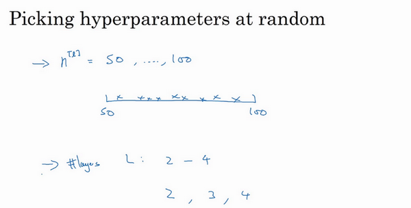 假设你要选取隐藏单元的数量,假设,你选取的取值范围是从50到100中某点,这种情况下,看到这条从50-100的数轴,你可以随机在其取点,这是一个搜索特定超参数的很直观的方式。或者,如果你要选取神经网络的层数,我们称之为字母,你也许会选择层数为2到4中的某个值,接着顺着2,3,4随机均匀取样才比较合理,你还可以应用网格搜索,你会觉得2,3,4,这三个数值是合理的,这是在几个在你考虑范围内随机均匀取值的例子,这些取值还蛮合理的,但对某些超参数而言不适用。
