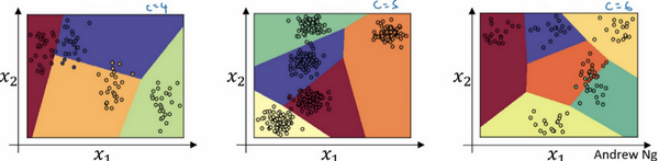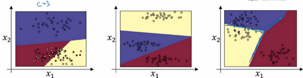 这是(中间图)另一个Softmax分类器可以代表的决策边界的例子,用有三个分类的数据集来训练,这里(右边图)还有一个。对吧,但是直觉告诉我们,任何两个分类之间的决策边界都是线性的,这就是为什么你看到,比如这里黄色和红色分类之间的决策边界是线性边界,紫色和红色之间的也是线性边界,紫色和黄色之间的也是线性决策边界,但它能用这些不同的线性函数来把空间分成三类。