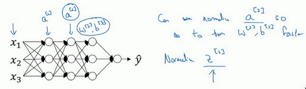 所以问题来了,对任何一个隐藏层而言,我们能否归一化值,在此例中,比如说的值,但可以是任何隐藏层的,以更快的速度训练,,因为是下一层的输入值,所以就会影响,的训练。简单来说,这就是Batch归一化的作用。尽管严格来说,我们真正归一化的不是,而是,深度学习文献中有一些争论,关于在激活函数之前是否应该将值归一化,或是否应该在应用激活函数后再规范值。实践中,经常做的是归一化,所以这就是我介绍的版本,我推荐其为默认选择,那下面就是Batch归一化的使用方法。