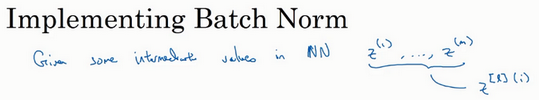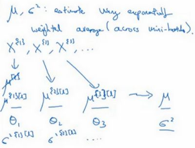 我们选择层,假设我们有mini-batch,,,……以及对应的值等等,那么在为层训练时,你就得到了,我还是把它写做第一个mini-batch和这一层的吧,()。当你训练第二个mini-batch,在这一层和这个mini-batch中,你就会得到第二个()值。然后在这一隐藏层的第三个mini-batch,你得到了第三个()值。正如我们之前用的指数加权平均来计算,,的均值,当时是试着计算当前气温的指数加权平均,你会这样来追踪你看到的这个均值向量的最新平均值,于是这个指数加权平均就成了你对这一隐藏层的均值的估值。同样的,你可以用指数加权平均来追踪你在这一层的第一个mini-batch中所见的的值,以及第二个mini-batch中所见的的值等等。因此在用不同的mini-batch训练神经网络的同时,能够得到你所查看的每一层的和的平均数的实时数值。