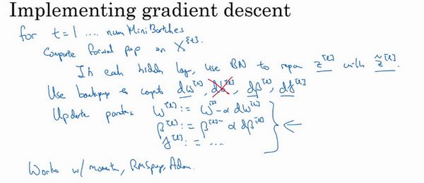 如果你已将梯度计算如下,你就可以使用梯度下降法了,这就是我写到这里的,但也适用于有Momentum、RMSprop、Adam的梯度下降法。与其使用梯度下降法更新mini-batch,你可以使用这些其它算法来更新,我们在之前几个星期中的视频中讨论过的,也可以应用其它的一些优化算法来更新由Batch归一化添加到算法中的 和 参数。