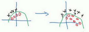 如果图像中,你的训练集是这个样子的,你的正面例子在这儿,反面例子在那儿(左图),但你试图把它们都统一于一个数据集,也许正面例子在这,反面例子在那儿(右图)。你也许无法期待,在左边训练得很好的模块,同样在右边也运行得很好,即使存在运行都很好的同一个函数,但你不会希望你的学习算法去发现绿色的决策边界,如果只看左边数据的话。