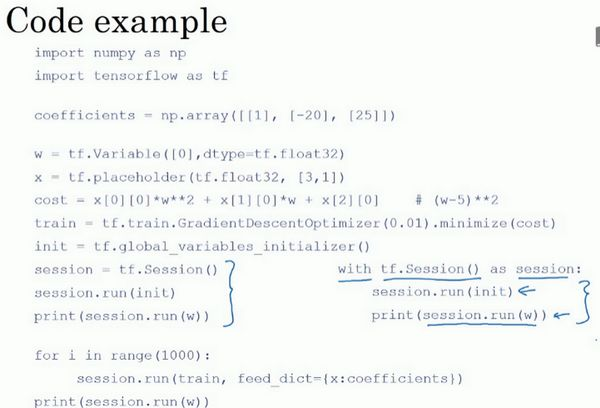 但这个with结构也会在很多TensorFlow程序中用到,它的意思基本上和左边的相同,但是Python中的with命令更方便清理,以防在执行这个内循环时出现错误或例外。所以你也会在编程练习中看到这种写法。那么这个代码到底做了什么呢?让我们看这个等式: