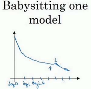 一种是你照看一个模型,通常是有庞大的数据组,但没有许多计算资源或足够的CPU和GPU的前提下,基本而言,你只可以一次负担起试验一个模型或一小批模型,在这种情况下,即使当它在试验时,你也可以逐渐改良。比如,第0天,你将随机参数初始化,然后开始试验,然后你逐渐观察自己的学习曲线,也许是损失函数J,或者数据设置误差或其它的东西,在第1天内逐渐减少,那这一天末的时候,你可能会说,看,它学习得真不错。我试着增加一点学习速率,看看它会怎样,也许结果证明它做得更好,那是你第二天的表现。两天后,你会说,它依旧做得不错,也许我现在可以填充下Momentum或减少变量。然后进入第三天,每天,你都会观察它,不断调整你的参数。也许有一天,你会发现你的学习率太大了,所以你可能又回归之前的模型,像这样,但你可以说是在每天花时间照看此模型,即使是它在许多天或许多星期的试验过程中。所以这是一个人们照料一个模型的方法,观察它的表现,耐心地调试学习率,但那通常是因为你没有足够的计算能力,不能在同一时间试验大量模型时才采取的办法。
