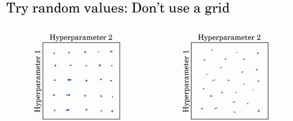 在深度学习领域,我们常做的,我推荐你采用下面的做法,随机选择点,所以你可以选择同等数量的点,对吗?25个点,接着,用这些随机取的点试验超参数的效果。之所以这么做是因为,对于你要解决的问题而言,你很难提前知道哪个超参数最重要,正如你之前看到的,一些超参数的确要比其它的更重要。