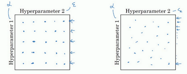 举个例子,假设超参数1是(学习速率),取一个极端的例子,假设超参数2是Adam算法中,分母中的。在这种情况下,的取值很重要,而取值则无关紧要。如果你在网格中取点,接着,你试验了的5个取值,那你会发现,无论取何值,结果基本上都是一样的。所以,你知道共有25种模型,但进行试验的值只有5个,我认为这是很重要的。