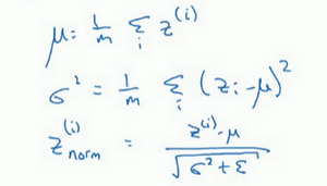 在神经网络中,已知一些中间值,假设你有一些隐藏单元值,从到,这些来源于隐藏层,所以这样写会更准确,即为隐藏层,从1到,但这样书写,我要省略及方括号,以便简化这一行的符号。所以已知这些值,如下,你要计算平均值,强调一下,所有这些都是针对层,但我省略及方括号,然后用正如你常用的那个公式计算方差,接着,你会取每个值,使其规范化,方法如下,减去均值再除以标准偏差,为了使数值稳定,通常将作为分母,以防的情况。