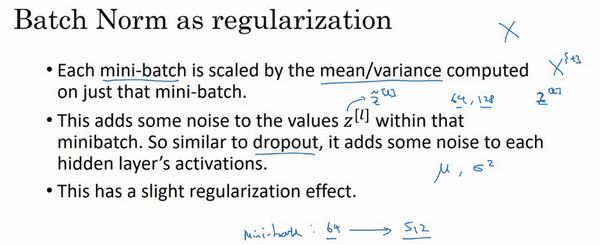对比而言,Batch归一化含几重噪音,因为标准偏差的缩放和减去均值带来的额外噪音。这里的均值和标准差的估计值也是有噪音的,所以类似于dropout,Batch归一化有轻微的正则化效果,因为给隐藏单元添加了噪音,这迫使后部单元不过分依赖任何一个隐藏单元,类似于dropout,它给隐藏层增加了噪音,因此有轻微的正则化效果。因为添加的噪音很微小,所以并不是巨大的正则化效果,你可以将Batch归一化和dropout一起使用,如果你想得到dropout更强大的正则化效果。
