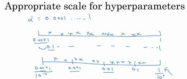 希望能帮助你选择合适的标尺,来给超参数取值。如果你没有在超参数选择中作出正确的标尺决定,别担心,即使你在均匀的标尺上取值,如果数值总量较多的话,你也会得到还不错的结果,尤其是应用从粗到细的搜索方法,在之后的迭代中,你还是会聚焦到有用的超参数取值范围上。