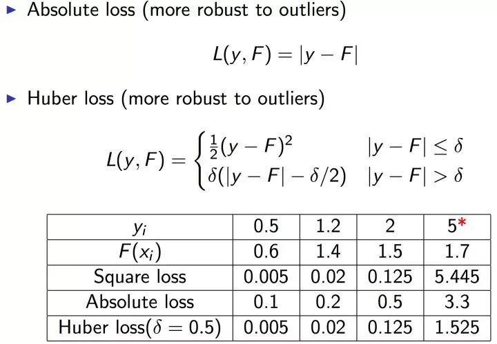 很明显后续的模型会对第 4 个值关注过多,这不是一种好的现象,所以一般回归类的损失函数会用绝对损失或者 Huber 损失函数来代替平方损失函数。