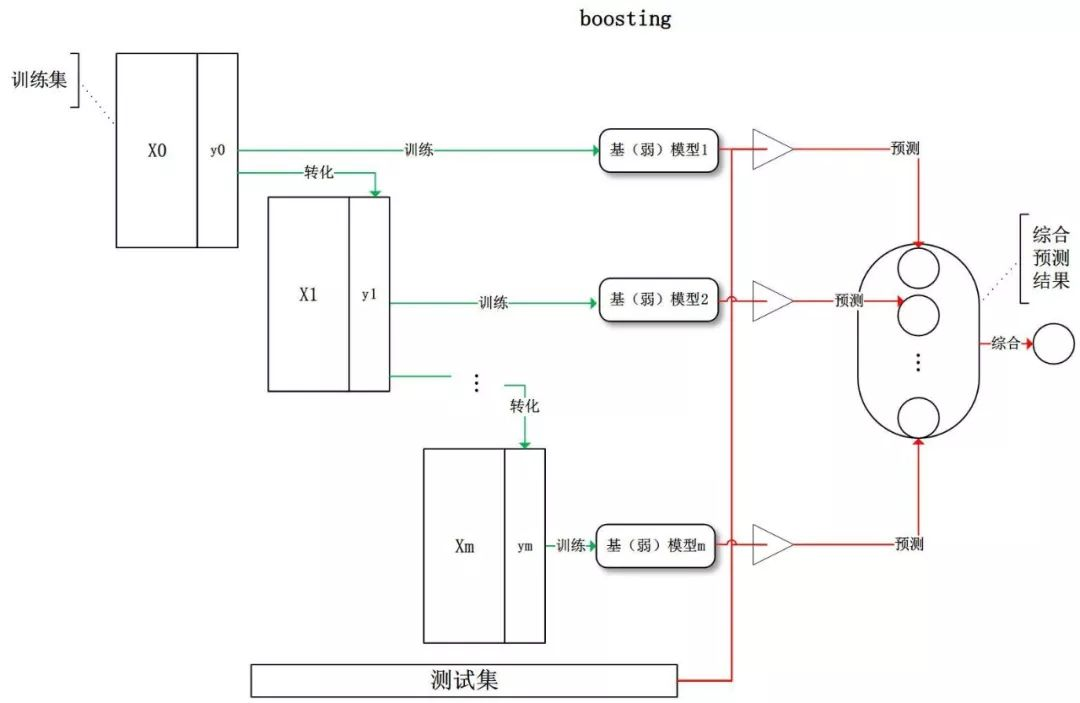 Boosting 训练过程为阶梯状,基模型的训练是有顺序的,每个基模型都会在前一个基模型学习的基础上进行学习,最终综合所有基模型的预测值产生最终的预测结果,用的比较多的综合方式为加权法。