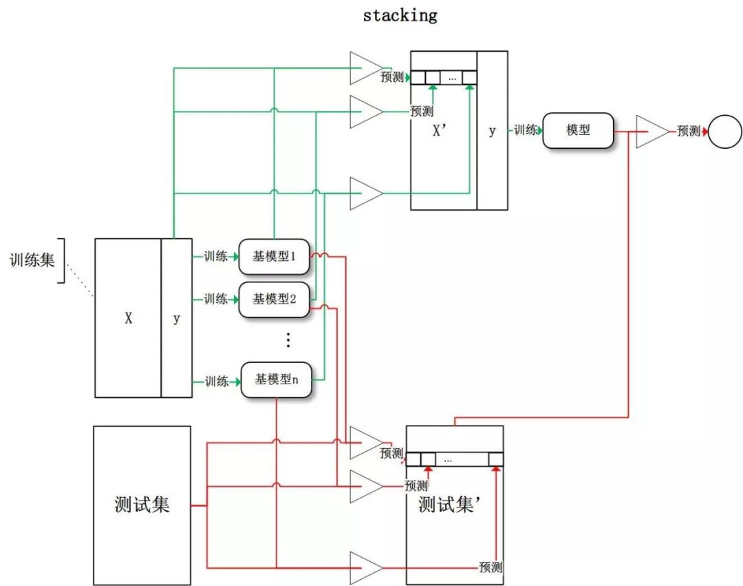 Stacking 是先用全部数据训练好基模型,然后每个基模型都对每个训练样本进行的预测,其预测值将作为训练样本的特征值,最终会得到新的训练样本,然后基于新的训练样本进行训练得到模型,然后得到最终预测结果。