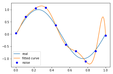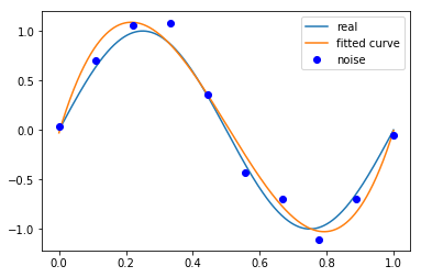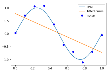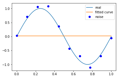 y = [np.random.normal(0, 0.1) + y1 for y1 in y_]def fitting(M=0):"""M 为 多项式的次数"""# 随机初始化多项式参数p_init = np.random.rand(M + 1)# 最小二乘法p_lsq = leastsq(residuals_func, p_init, args=(x, y))print('Fitting Parameters:', p_lsq[0])# 可视化plt.plot(x_points, real_func(x_points), label='real')plt.plot(x_points, fit_func(p_lsq[0], x_points), label='fitted curve')plt.plot(x, y, 'bo', label='noise')plt.legend()return p_lsq