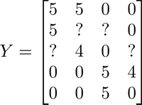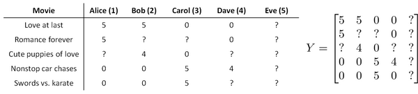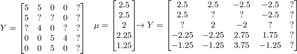 Ynorm = np.zeros((movies, users))for i in range(movies):idx = np.where(R[i,:] == 1)[0]Ymean[i] = Y[i,idx].mean()Ynorm[i,idx] = Y[i,idx] - Ymean[i]Ynorm.mean()