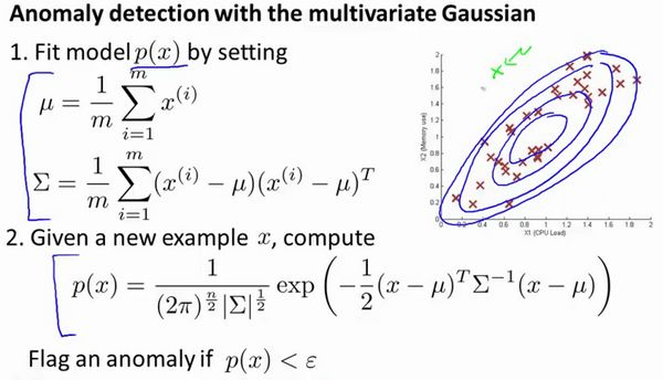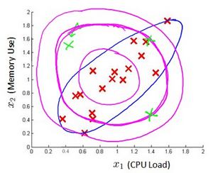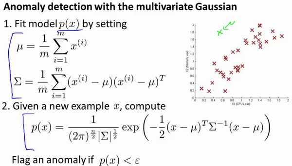 下图中是两个相关特征,洋红色的线(根据 ε 的不同其范围可大可小)是一般的高斯分布模型获得的判定边界,很明显绿色的X所代表的数据点很可能是异常值,但是其值却仍然在正常范围内。多元高斯分布将创建像图中蓝色曲线所示的判定边界。