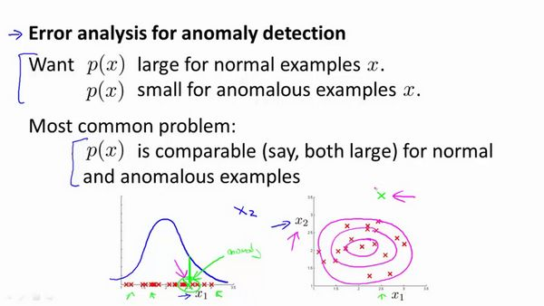 一个常见的问题是一些异常的数据可能也会有较高的值,因而被算法认为是正常的。这种情况下误差分析能够帮助我们,我们可以分析那些被算法错误预测为正常的数据,观察能否找出一些问题。我们可能能从问题中发现我们需要增加一些新的特征,增加这些新特征后获得的新算法能够帮助我们更好地进行异常检测。