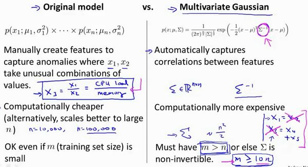 在一般的高斯分布模型中,我们计算 的方法是: 通过分别计算每个特征对应的几率然后将其累乘起来,在多元高斯分布模型中,我们将构建特征的协方差矩阵,用所有的特征一起来计算 。