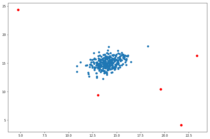 上图中,在蓝色圈内的数据属于该组数据的可能性较高,而越是偏远的数据,其属于该组数据的可能性就越低。