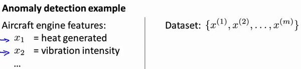 这里的每个点、每个叉,都是你的无标签数据。这样,异常检测问题可以定义如下:我们假设后来有一天,你有一个新的飞机引擎从生产线上流出,而你的新飞机引擎有特征变量。所谓的异常检测问题就是:我们希望知道这个新的飞机引擎是否有某种异常,或者说,我们希望判断这个引擎是否需要进一步测试。因为,如果它看起来像一个正常的引擎,那么我们可以直接将它运送到客户那里,而不需要进一步的测试。