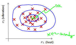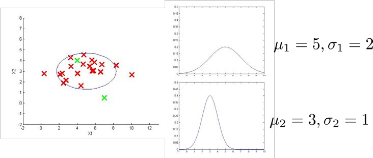 给定数据集 ,我们假使数据集是正常的,我们希望知道新的数据 是不是异常的,即这个测试数据不属于该组数据的几率如何。我们所构建的模型应该能根据该测试数据的位置告诉我们其属于一组数据的可能性 。