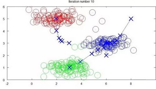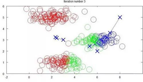 算法分为两个步骤,第一个for循环是赋值步骤,即:对于每一个样例,计算其应该属于的类。第二个for循环是聚类中心的移动,即:对于每一个类,重新计算该类的质心。