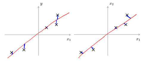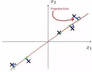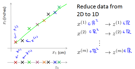 将数据从二维降至一维:假使我们要采用两种不同的仪器来测量一些东西的尺寸,其中一个仪器测量结果的单位是英寸,另一个仪器测量的结果是厘米,我们希望将测量的结果作为我们机器学习的特征。现在的问题的是,两种仪器对同一个东西测量的结果不完全相等(由于误差、精度等),而将两者都作为特征有些重复,因而,我们希望将这个二维的数据降至一维。