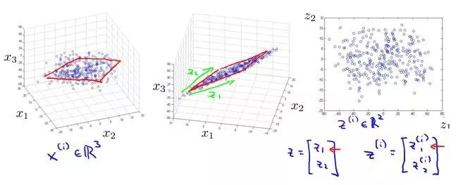 将数据从三维降至二维:这个例子中我们要将一个三维的特征向量降至一个二维的特征向量。过程是与上面类似的,我们将三维向量投射到一个二维的平面上,强迫使得所有的数据都在同一个平面上,降至二维的特征向量。