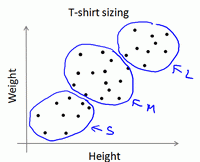 K-均值算法也可以很便利地用于将数据分为许多不同组,即使在没有非常明显区分的组群的情况下也可以。下图所示的数据集包含身高和体重两项特征构成的,利用K-均值算法将数据分为三类,用于帮助确定将要生产的 T-恤衫的三种尺寸。