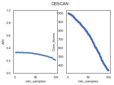 def test_DBSCAN_min_samples(*data):'''测试 DBSCAN 的聚类结果随 min_samples 参数的影响:param data: 可变参数。它是一个元组。元组元素依次为:第一个元素为样本集,第二个元素为样本集的真实簇分类标记:return: None'''X,labels_true=datamin_samples=range(1,100)ARIs=[]Core_nums=[]for num in min_samples:clst=cluster.DBSCAN(min_samples=num)predicted_labels=clst.fit_predict(X)ARIs.append( adjusted_rand_score(labels_true,predicted_labels))Core_nums.append(len(clst.core_sample_indices_))## 绘图fig=plt.figure()ax=fig.add_subplot(1,2,1)ax.plot(min_samples,ARIs,marker='+')ax.set_xlabel( "min_samples")ax.set_ylim(0,1)ax.set_ylabel('ARI')ax=fig.add_subplot(1,2,2)ax.plot(min_samples,Core_nums,marker='o')ax.set_xlabel( "min_samples")ax.set_ylabel('Core_Nums')fig.suptitle("DBSCAN")plt.show()centers=[[1,1],[2,2],[1,2],[10,20]] # 用于产生聚类的中心点