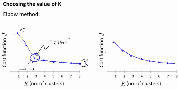 我们可能会得到一条类似于这样的曲线。像一个人的肘部。这就是“肘部法则”所做的,让我们来看这样一个图,看起来就好像有一个很清楚的肘在那儿。好像人的手臂,如果你伸出你的胳膊,那么这就是你的肩关节、肘关节、手。这就是“肘部法则”。你会发现这种模式,它的畸变值会迅速下降,从 1 到 2,从 2 到 3 之后,你会在 3 的时候达到一个肘点。在此之后,畸变值就下降的非常慢,看起来就像使用 3 个聚类来进行聚类是正确的,这是因为那个点是曲线的肘点,畸变值下降得很快,之后就下降得很慢,那么我们就选。当你应用“肘部法则”的时候,如果你得到了一个像上面这样的图,那么这将是一种用来选择聚类个数的合理方法。