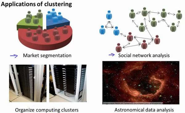 在这门课程的早些时候,我曾经列举过一些应用:比如市场分割。也许你在数据库中存储了许多客户的信息,而你希望将他们分成不同的客户群,这样你可以对不同类型的客户分别销售产品或者分别提供更适合的服务。社交网络分析:事实上有许多研究人员正在研究这样一些内容,他们关注一群人,关注社交网络,例如Facebook,Google+,或者是其他的一些信息,比如说:你经常跟哪些人联系,而这些人又经常给哪些人发邮件,由此找到关系密切的人群。因此,这可能需要另一个聚类算法,你希望用它发现社交网络中关系密切的朋友。我有一个朋友正在研究这个问题,他希望使用聚类算法来更好的组织计算机集群,或者更好的管理数据中心。因为如果你知道数据中心中,那些计算机经常协作工作。那么,你可以重新分配资源,重新布局网络。由此优化数据中心,优化数据通信。