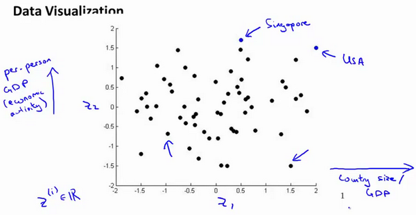 假使我们有有关于许多不同国家的数据,每一个特征向量都有 50 个特征(如GDP,人均GDP,平均寿命等)。如果要将这个 50 维的数据可视化是不可能的。使用降维的方法将其降至 2 维,我们便可以将其可视化了。