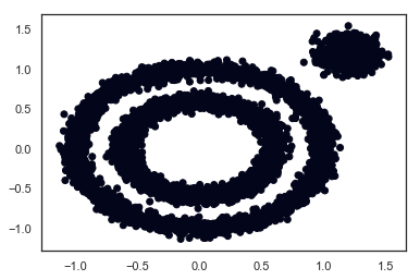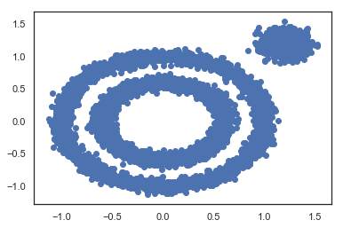 X2, y2 = datasets.make_blobs(n_samples=1000, n_features=2, centers=[[1.2,1.2]], cluster_std=[[.1]],random_state=9)X = np.concatenate((X1, X2))