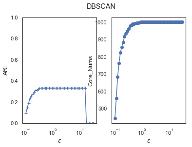 def test_DBSCAN_epsilon(*data):'''测试 DBSCAN 的聚类结果随 eps 参数的影响:param data: 可变参数。它是一个元组。元组元素依次为:第一个元素为样本集,第二个元素为样本集的真实簇分类标记:return: None'''X,labels_true=dataepsilons=np.logspace(-1,1.5)ARIs=[]Core_nums=[]for epsilon in epsilons:clst=cluster.DBSCAN(eps=epsilon)predicted_labels=clst.fit_predict(X)ARIs.append( adjusted_rand_score(labels_true,predicted_labels))Core_nums.append(len(clst.core_sample_indices_))## 绘图fig=plt.figure()ax=fig.add_subplot(1,2,1)ax.plot(epsilons,ARIs,marker='+')ax.set_xscale('log')ax.set_xlabel(r"$\epsilon$")ax.set_ylim(0,1)ax.set_ylabel('ARI')ax=fig.add_subplot(1,2,2)ax.plot(epsilons,Core_nums,marker='o')ax.set_xscale('log')ax.set_xlabel(r"$\epsilon$")ax.set_ylabel('Core_Nums')fig.suptitle("DBSCAN")plt.show()
