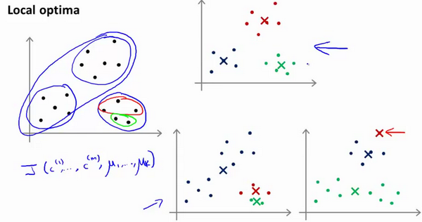 回顾刚才给出的:K-均值迭代算法,我们知道,第一个循环是用于减小引起的代价,而第二个循环则是用于减小引起的代价。迭代的过程一定会是每一次迭代都在减小代价函数,不然便是出现了错误。