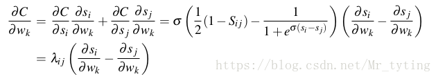 这一步不太好理解,举例来说:假设有三个文档,其中有,则集合 中就包含 共三个文档对,则按照上面损失函数对参数 求偏导的公式来说有: