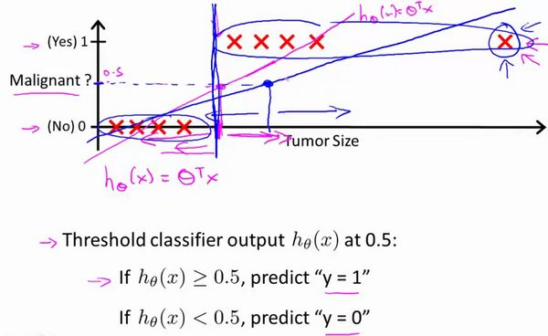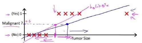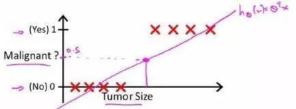 这时,再使用 0.5 作为阀值来预测肿瘤是良性还是恶性便不合适了。可以看出,线性回归模型,因为其预测的值可以超越[0,1]的范围,并不适合解决这样的问题。