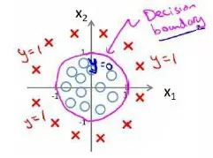 因为需要用曲线才能分隔 的区域和 的区域,我们需要二次方特征:是[-1 0 0 1 1],则我们得到的判定边界恰好是圆点在原点且半径为 1 的圆形。