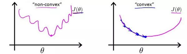 对于线性回归模型,我们定义的代价函数是所有模型误差的平方和。理论上来说,我们也可以对逻辑回归模型沿用这个定义,但是问题在于,当我们将带入到这样定义了的代价函数中时,我们得到的代价函数将是一个非凸函数(non-convexfunction)。
