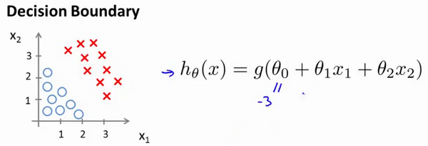并且参数 是向量[-3 1 1]。则当,即时,模型将预测 。我们可以绘制直线,这条线便是我们模型的分界线,将预测为 1 的区域和预测为 0 的区域分隔开。