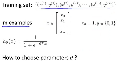 在这段视频中,我们要介绍如何拟合逻辑回归模型的参数。具体来说,我要定义用来拟合参数的优化目标或者叫代价函数,这便是监督学习问题中的逻辑回归模型的拟合问题。