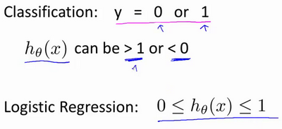 如果我们要用线性回归算法来解决一个分类问题,对于分类, 取值为 0 或者 1,但如果你使用的是线性回归,那么假设函数的输出值可能远大于 1,或者远小于 0,即使所有训练样本的标签 都等于 0 或 1。尽管我们知道标签应该取值 0 或者 1,但是如果算法得到的值远大于 1 或者远小于 0 的话,就会感觉很奇怪。所以我们在接下来的要研究的算法就叫做逻辑回归算法,这个算法的性质是:它的输出值永远在 0 到 1 之间。